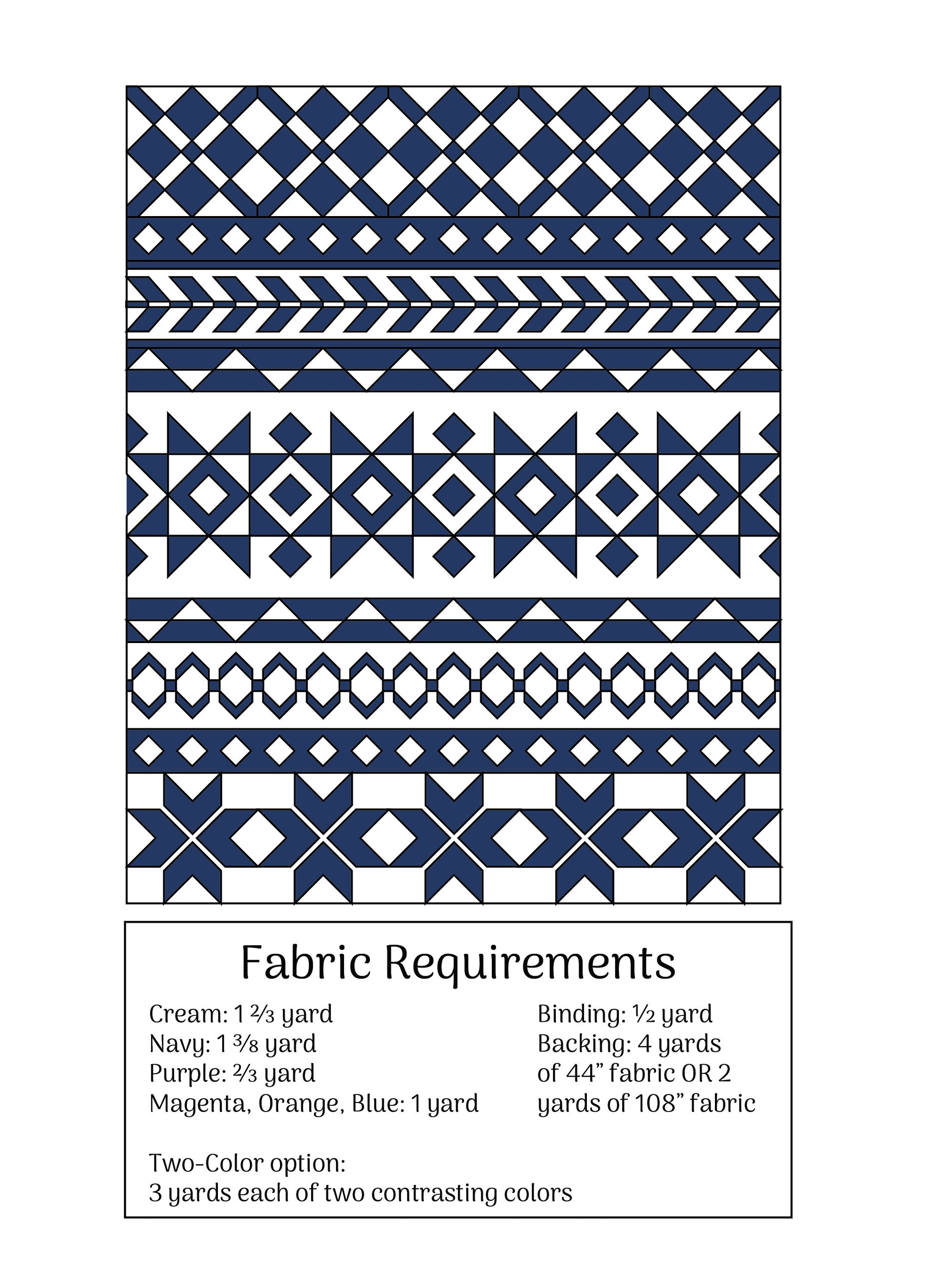 Melding the crafts of row quilts and stranded knitting, Stranded on the Prairie is a pattern inspired by the beautiful artistry of Fair Isle and Scandinavian-style knitting patterns. This pattern makes a beautiful quilt whether you choose the elegant simplicity of a two-color design or go to the opposite extreme of a scrappy quilt with nearly every piece a different fabric.